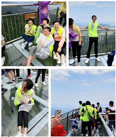 在奥陶纪,有些人可能是为了观赏景观,有些人爬山可能是为了亲近自然、锻炼身体,我们这次爬山是为了“挑战自我,征服自我”。到达目的地后,大家直奔奥陶纪“世界第一天空悬廊”,这条走廊悬于数百米高的峭壁之上,成“A”形,沿悬崖向外挑出近70米,从内往外由宽逐渐变窄,桥面铺设全透明陶瓷,走在上面摇晃感明显,特别惊险刺激。