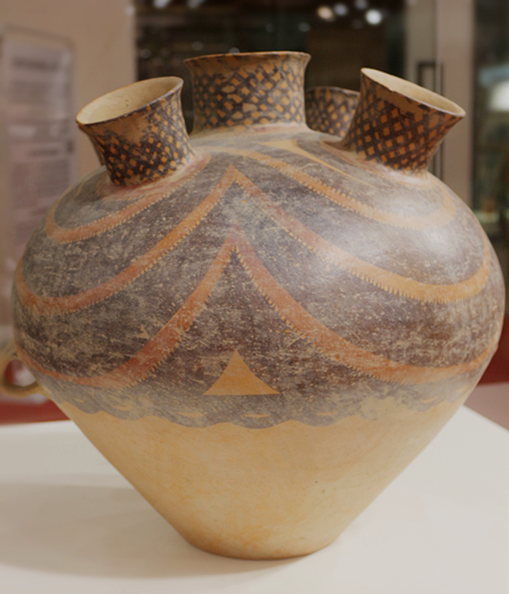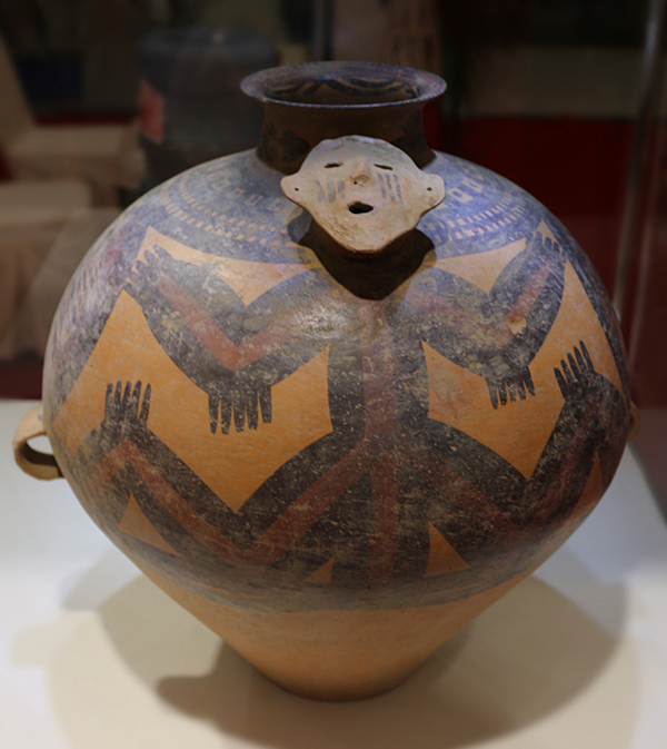 马家窑文化彩陶,因一九二三年首先发现于甘肃临洮的马家窑村而得名。它出现于距今五千八百多年的新石器时代晚期,历经了三千多年的发展。主要有石岭下、马家窑、半山、马厂等类型。它的三个类型代表了三个时期的文化思潮和社会状态。马家窑类型彩陶画着大量水波纹,这个时期是崇敬和赞美水的水文化时期;半山类型彩陶初期画着大旋涡纹,之后逐渐变为四圈纹,表达田园和土地。这个时期是先民们从水崇拜逐渐转向土地崇拜的土地文化时期;马厂类型初期画着四圈纹,随后将四圈纹转为两圈纹,另两面画上能够战胜水患,保护土地的蛙神纹,先民表达了强烈希望战胜水患的要求,出现了战胜自然的思想。