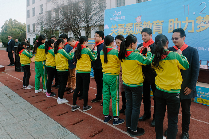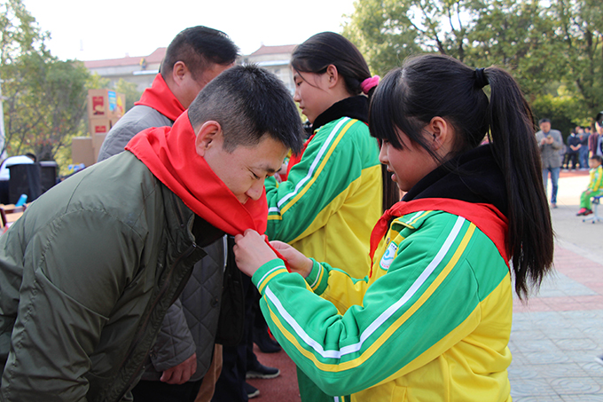 孩子们心怀感恩,为这些充满爱心的叔叔阿姨们戴上了他们眼中最珍贵的红领巾。