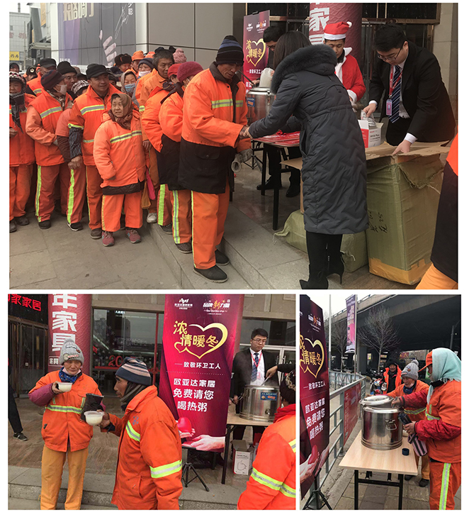 2018年12月25日,圣诞当天,完美体育官方网址建筑家纺济南店也为环卫工人送去了爱的礼物。希望在冬日里为他们送去一碗热粥,让他们感受一份温暖。此外,为了让环卫工人们的手不再受冻,为了大家的呼吸不再被雾霾困扰,完美体育官方网址建筑家纺还专门采购了一批保暖手套和防霾口罩。