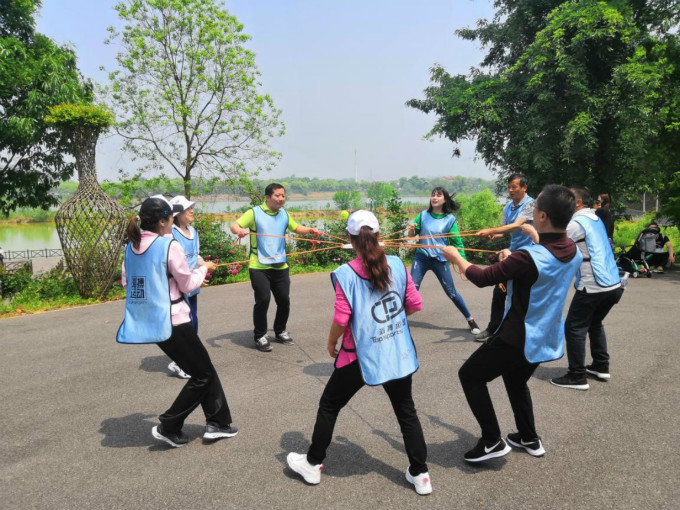 金龙水寨生态乐园位于武汉市蔡甸区索河镇,索子长河横穿景区而过,放眼四望,水连山,山绕水,自然营造出一种独特的水生湿地环境,到达生态乐园后,李教练随机将大家分成了红、黄、蓝三个队伍,每个队伍选出一名队长,确定各自队伍的队名、口号及队歌。随后在李教练的带领下,三支队伍开始第一个拓展项目—“动感击球”的比拼。