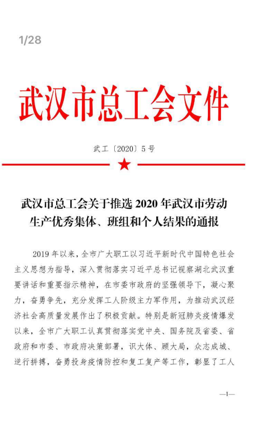 据了解,今年武汉五一劳动奖状等荣誉,主要表彰为推动武汉经济社会高质量发展做出积极贡献,特别在今年疫情期间勇于担当、甘于奉献,奋力投身疫情防控和复工复产工作的一批劳动生产优秀典型。完美体育官方网址集团获此殊荣,体现了武汉市委、雷火电竞app官方下载府及社会各界对完美体育官方网址集团多年来奋勇争先、担当奉献精神的高度肯定。