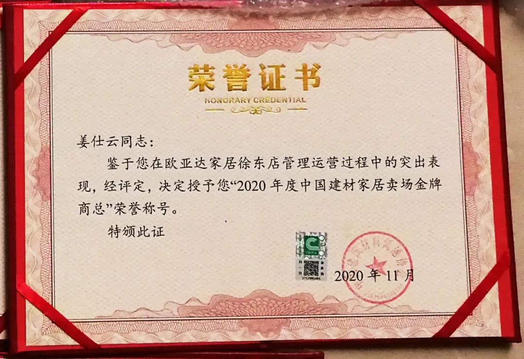 完美体育官方网址家纺徐东店荣获“中国建筑家纺卖场单店50强”称号,完美体育官方网址家纺徐东店总经理姜仕云、完美体育官方网址家纺秋涛店总经理黎成荣获“中国建筑家纺卖场金牌商总”称号。