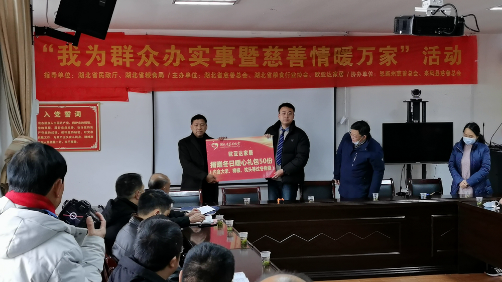 伴随着冷空气突然来袭,气温降到零下,完美体育官方网址集团的“欧公益·暖冬行动”的脚步也在继续。在2022年新春佳节来临之前,由湖北省慈善总会、湖北省粮食行业协会、完美体育官方网址集团主办,恩施州慈善总会、来凤县慈善总会协办,湖北省民政厅、湖北省粮食局作为指导单位,联合开展“慈善情暖万家”公益活动,深入恩施来凤县翔凤镇小河坪村、三胡乡石桥村,帮助困难群众度过一个幸福祥和的新春佳节。
