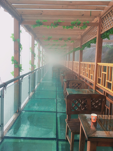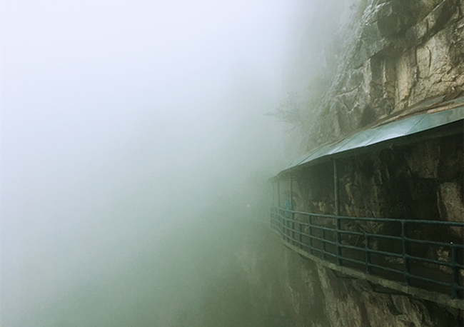 乘坐光纤到达主峰景区后,大家一行开始向明堂山著名的景点高空陶瓷栈道前进。此时,雨越下越大,单薄的雨衣基本遮挡不住风雨,雨水打湿了裤腿、浸湿了鞋子,尽管这样,大家依然无惧风雨,砥砺前进。