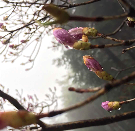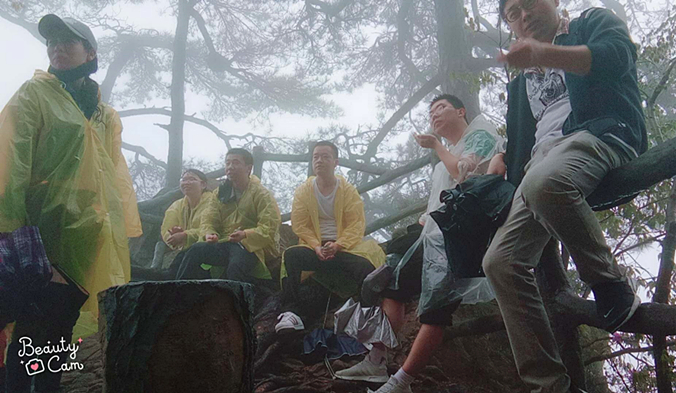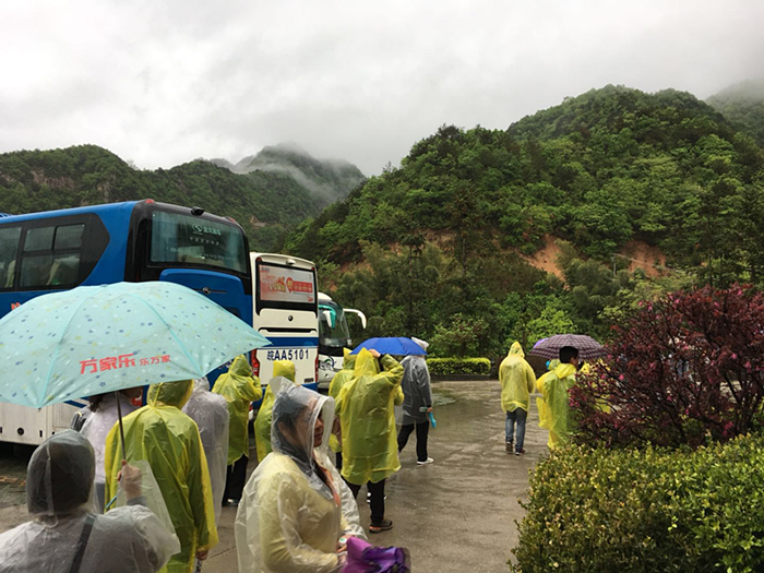 奈何天公不作美,当到达景区时,景区正下雨并不时伴有打雷。这对于下午的爬山行程非常不利,虽有担忧,但大家都没有放弃。小伙伴们在景区旁的明堂山酒店吃过午餐后,准备好相关雨具就开始向明堂山挺进。