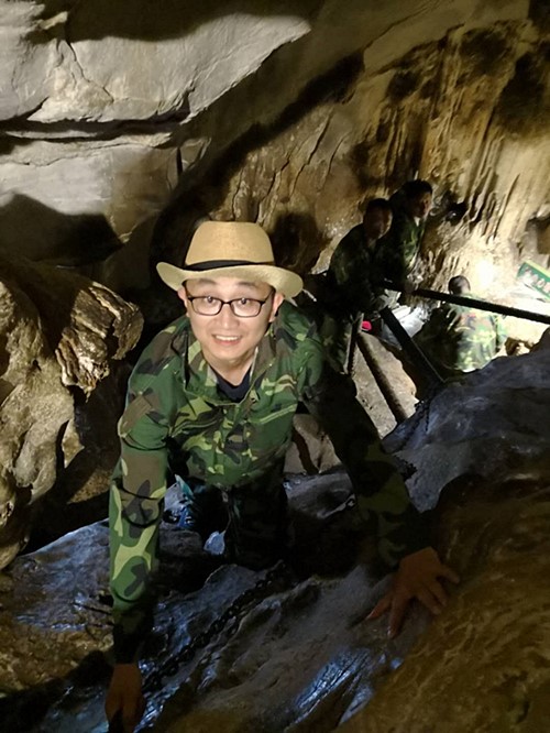 饭后,来不及休息,六支队伍在教练在带领下直奔当地著名的景点王莽洞。进洞前,大伙儿并未曾想到,即将面临一场异常艰苦的挑战。毕竟玩过那么多溶洞,无非都是欣赏各种鬼斧神工的天然钟乳石。但一踏入洞口,小欧首先就被那黑幽幽、深不见底的洞下天地给震住了,想领略洞中风景,必须先通过一道垂直狭窄的梯子下洞,秀气的妹子们克服心中恐惧,奋力攀爬,终于顺利下到洞中。