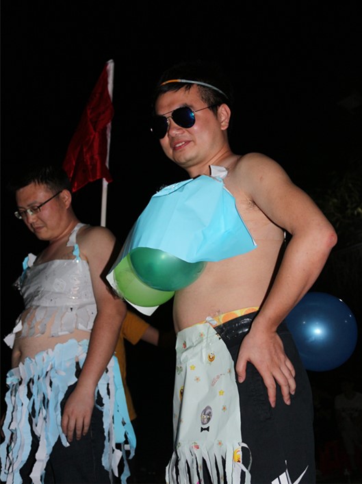 “今天你们设计成什么样,我就穿什么样!”在副总裁赵红平的表率下,胡勇和张杰两位总裁助理也都豁出去了。可是万万没想到的是,女队友们竟然给他们每人设计了一套性感无比的比基尼草裙!还有维蜜小天使的气球翅膀!在此,请颁给2队设计师一个最佳勇气奖!